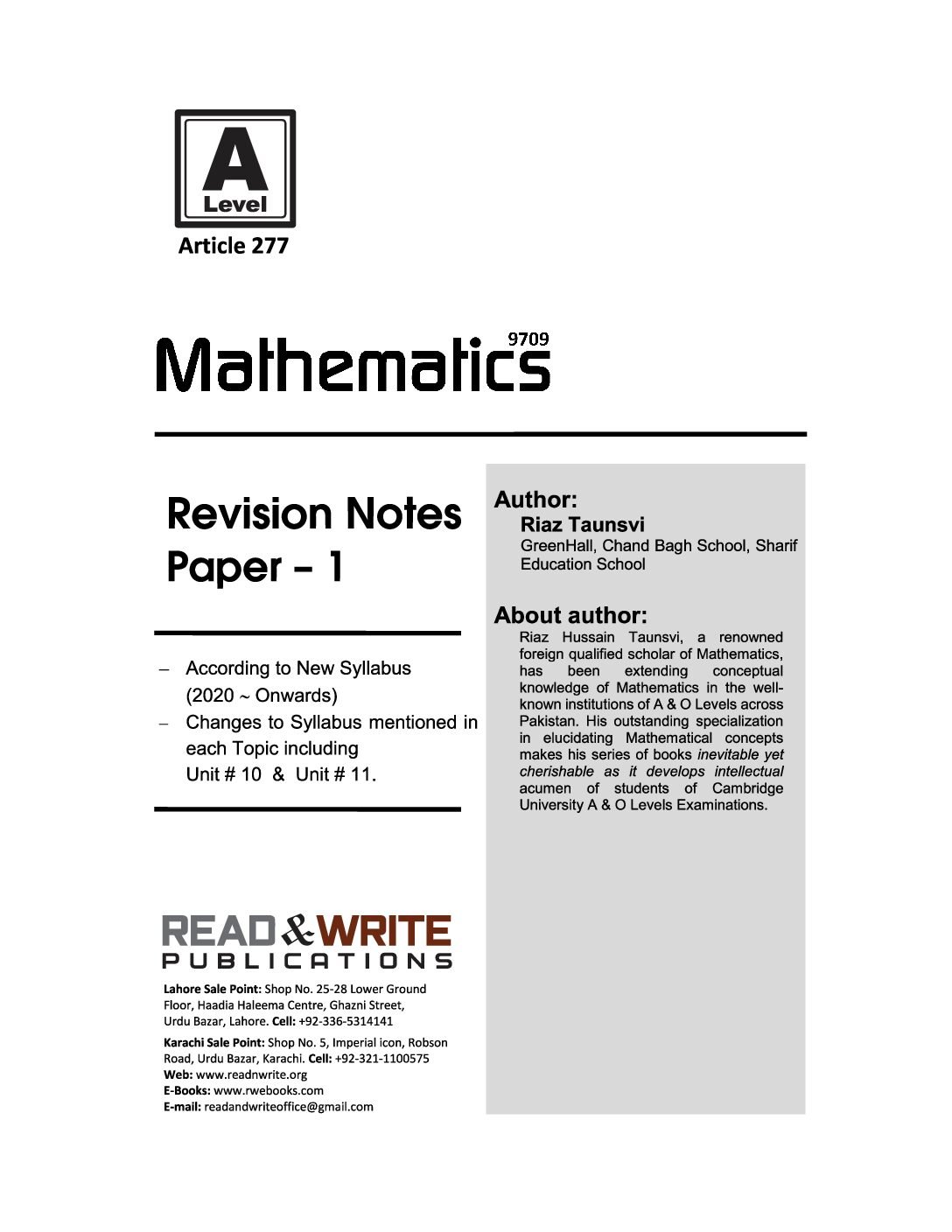 Mathematics A Level Paper-1 Revision Notes authored by Riaz Taunsvi provide a comprehensive and effective resource for students preparing for the Cambridge International Examinations (CIE) A Level Mathematics Paper 1. These meticulously crafted revision notes encompass the entire breadth of topics outlined in the CIE syllabus, offering students a solid understanding of fundamental mathematical concepts.