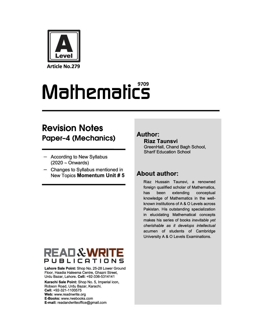 The 279 Mathematics A-Level Paper-4 (M1) Revision Notes by Riaz Taunsvi serve as an invaluable study resource for students preparing for the Mathematics A-Level Paper 4 (M1) exam. With comprehensive coverage, a problem-solving focus, and an exam-oriented approach, these revision notes will empower students to master the required concepts and confidently face the challenges of the exam. Maximize your potential and achieve your best results with this trusted companion in your A-Level Mathematics journey.